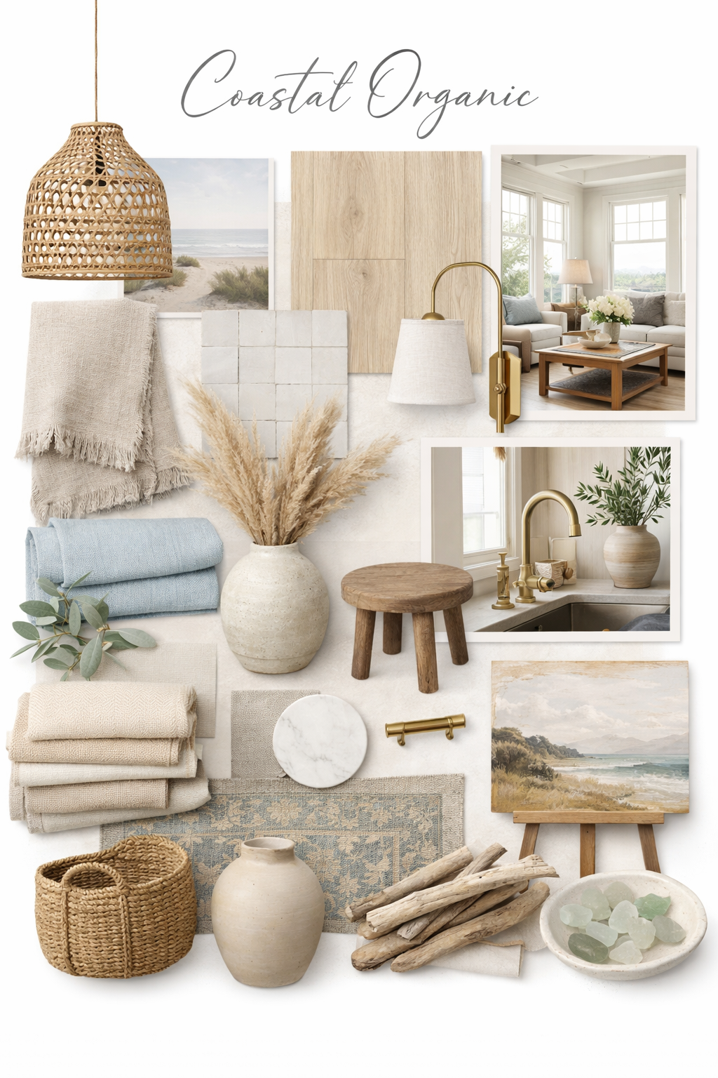 Below is a small mood board capturing the textures, tones, and feeling guiding every design decision throughout the home — a preview of the Coastal Organic atmosphere we hope to carry into every space.