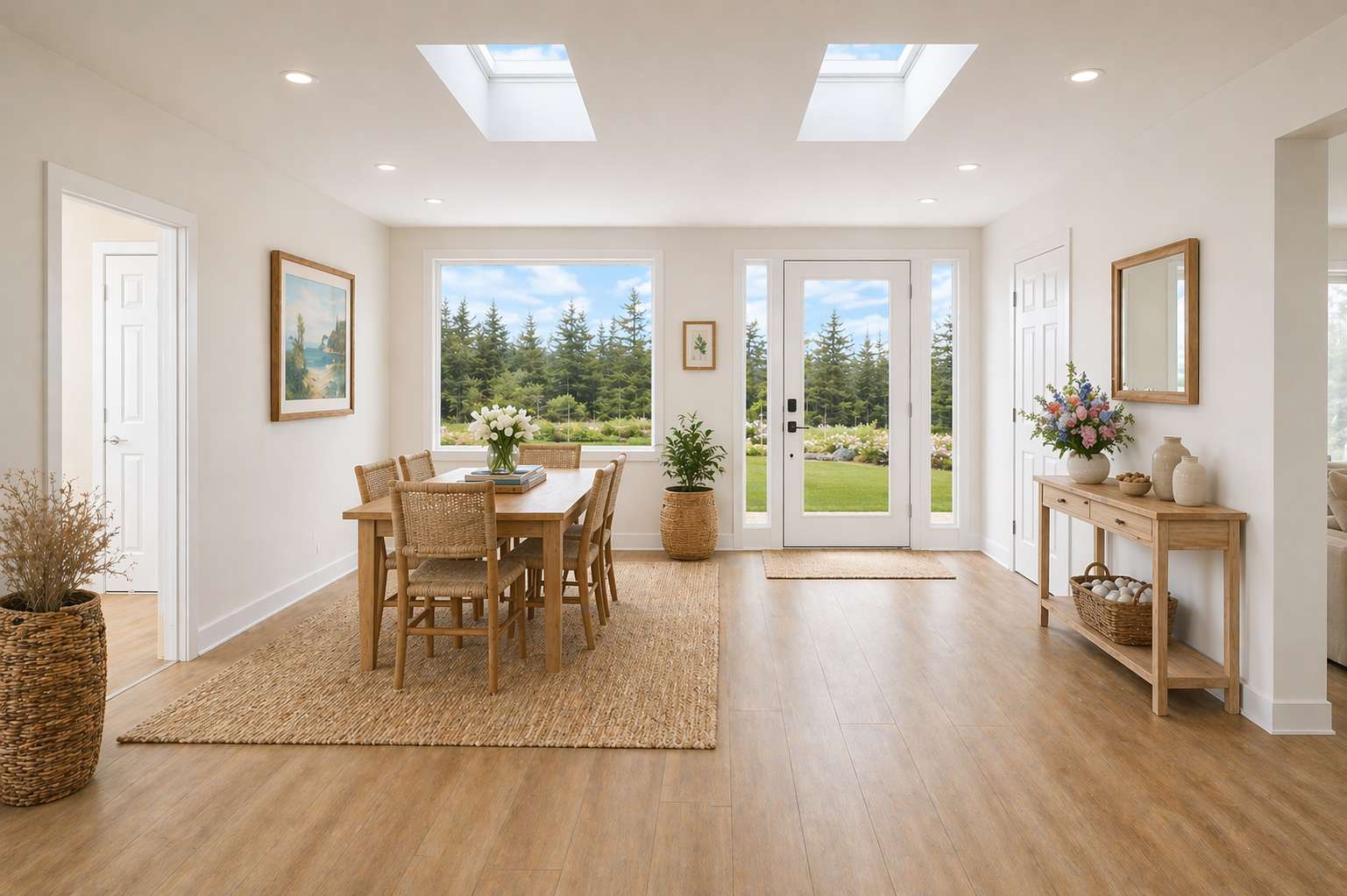 I wanted the entryway and dining area to feel immediately calm and welcoming, almost like a gentle transition from the outside world into something softer. Natural light, warm wood tones, and simple textures quietly introduce the Coastal Organic feel without trying too hard.